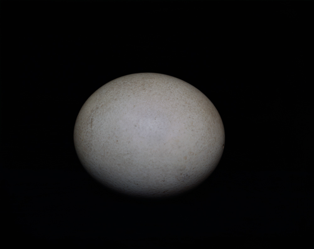 A Papuan hornbill curled fetus-like; a purple-crested turaco proudly displaying its noble crown-like head; an Amami jay with its resplendent, translucent azure sheen; a quetzal whose special feather structure allows it to swiftly alter the color and luster of its plumage; a chestnut-fronted macaw concealing feathers of a vibrant moss green... all hover in the gap between life and death, as if dozing. Then there are the skulls of creatures such as deer and elephants echoing of vanitas or memento mori; and huge, filled eggs serving as cosmic eggs, perhaps, or incubators.
