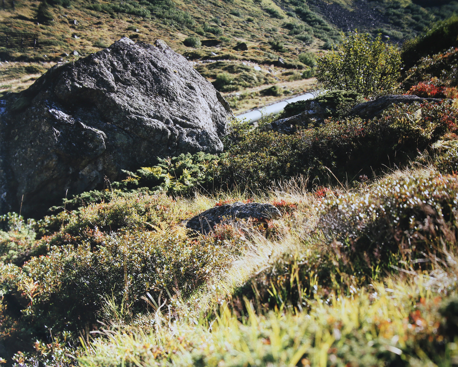 Devoted solely to the reliable transport of oil, the pipeline is a utility good, albeit an unusual one, that also possesses an unconscious functional beauty. Or rather, the secret allure harbored by something originally constructed with no consideration for it being seen, is exposed in the photographs. These are portraits of pipelines that only emerge when the photographer has an untrammeled command of that plastic power. The expressionless lines running between boulders seem masculine in form; under trees, almost touchingly determined, but at no point are they anthropomorphized. Detached, Ishizuka gauges and maintains a sense of distance from his subjects as he sets up the 8x10 camera.