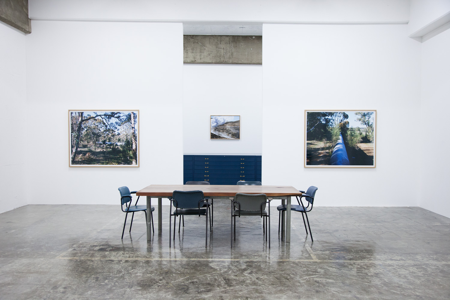 Pipelines in photos, stretching in a straight line across wilderness, somehow remind me of a single pencil line drawn across a blank sheet of paper, and it is from this that the exhibition title Demarcation is taken. The dictionary defines demarcation as a differentiation or boundary, referring to an area or disparity created when something is placed in a place where hitherto there was nothing.