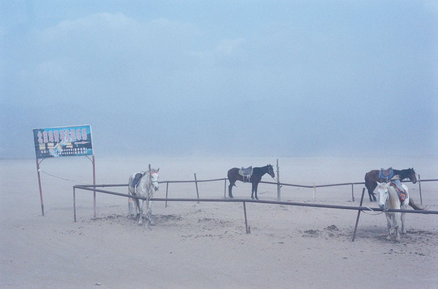 モンゴルの砂漠地帯では、砂埃による黄色一色の、他に何も見えない世界を見た。砂嵐が通り過ぎるまでの時間立ち往生し、イエローアウトと呼ぶしかないものすごい風音と黄色い世界の中で、その嵐が過ぎるのを待っていた。それでも車の窓の外をじっと見ていると、驚いたことに、我々のマイクロバスを風よけに、バイクに乗った若い夫婦が強風に身を縮めた姿が、砂嵐の切れ目切れ目にほんの一瞬見え隠れする。それは、幻でも見ているかのようだった。こういう過酷な大地で、自然の摂理に従って暮らす、人々のたくましさを思わない訳にはいかなかった。車が強風によって揺らされるたび、車の隙間という隙間から不気味にぼそぼそと黄色いものが車中に舞い落ちた。反対側の窓からは、草原で暮らす馬たちがやはり目を閉じ、耳をたたんで、身を縮め、黄色い嵐をやり過ごそうとしている寡黙な姿が、風景の中に霞んで見えた。
